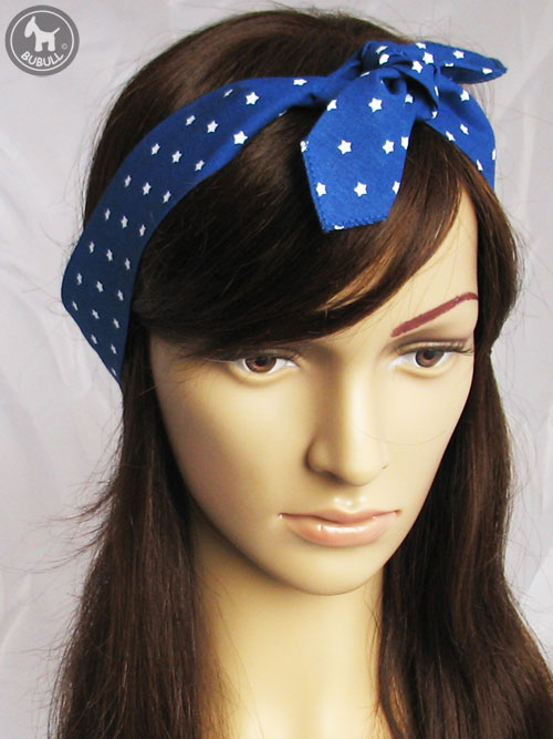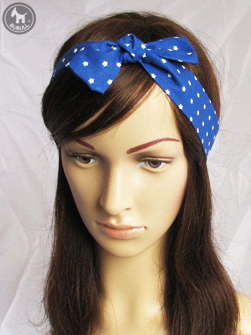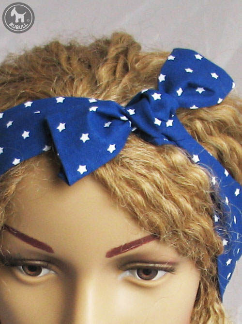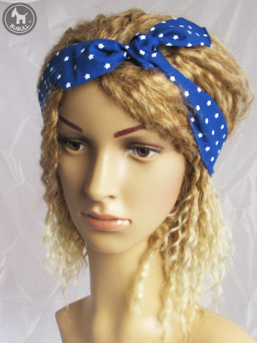 Bandeau fin en coton bleu avec étoiles blanches.