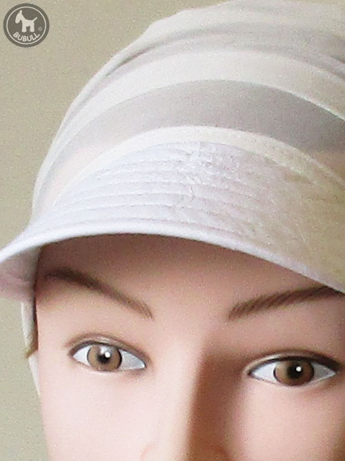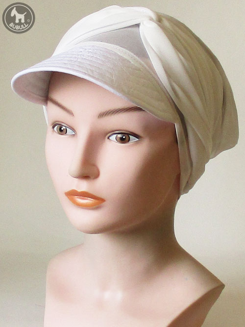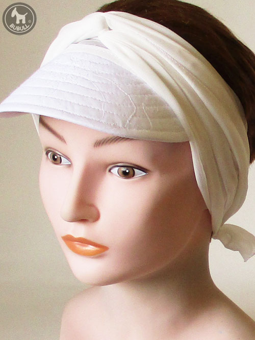 Bandeau – visière en voile de polyester avec visière coton . Celle ci est renforcée avec un matériel souple à l intérieur . Ce modèle est léger et fin. La visière est profonde: 7 cm au centre. Il existe également une version foulard et foulard visière avec le même tissus. Idéal pour le printemps-été et/ou cérémonie. Taille unique . Réglable. Coupe très actuelle, belle qualité souple, léger.et confortable.